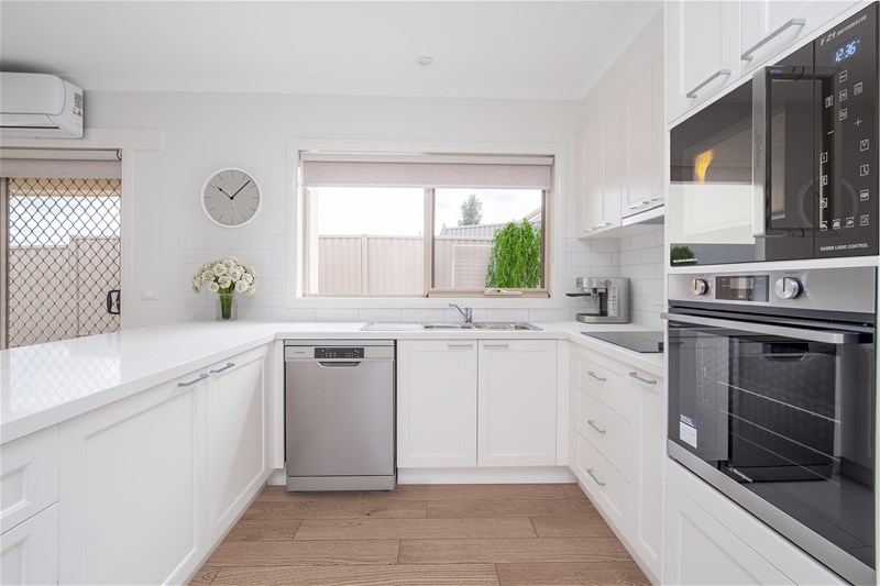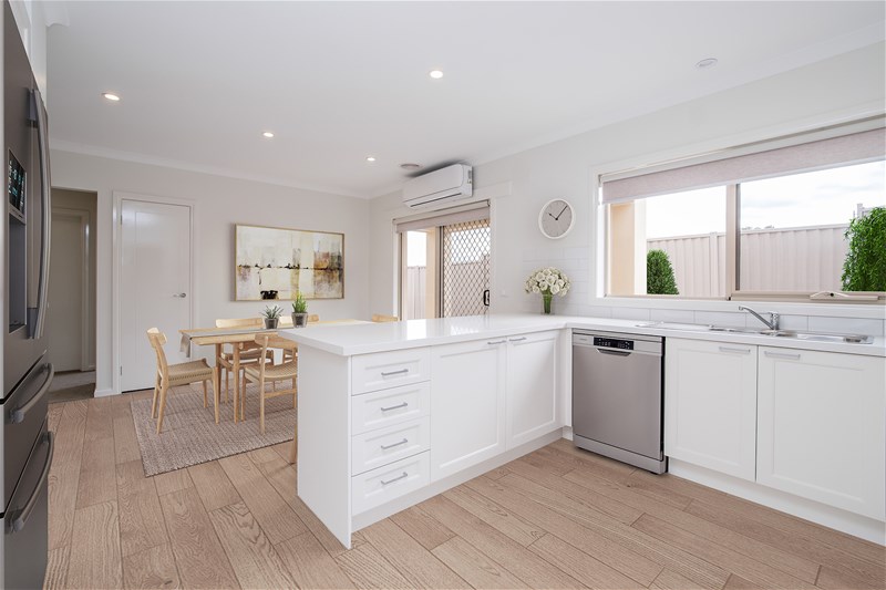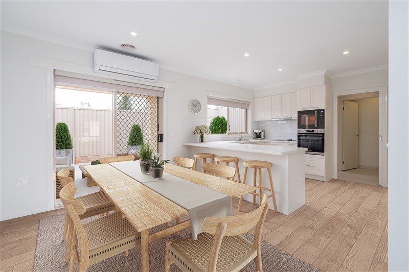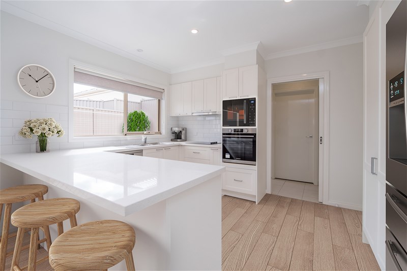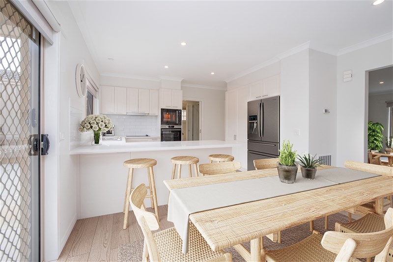 At the heart of the home is a light-filled living space that flows seamlessly into the dining area and beautifully appointed kitchen. Finished with a modern and stylish colour palette, the kitchen features quality appliances and plenty of room to cook, entertain, and enjoy daily life.